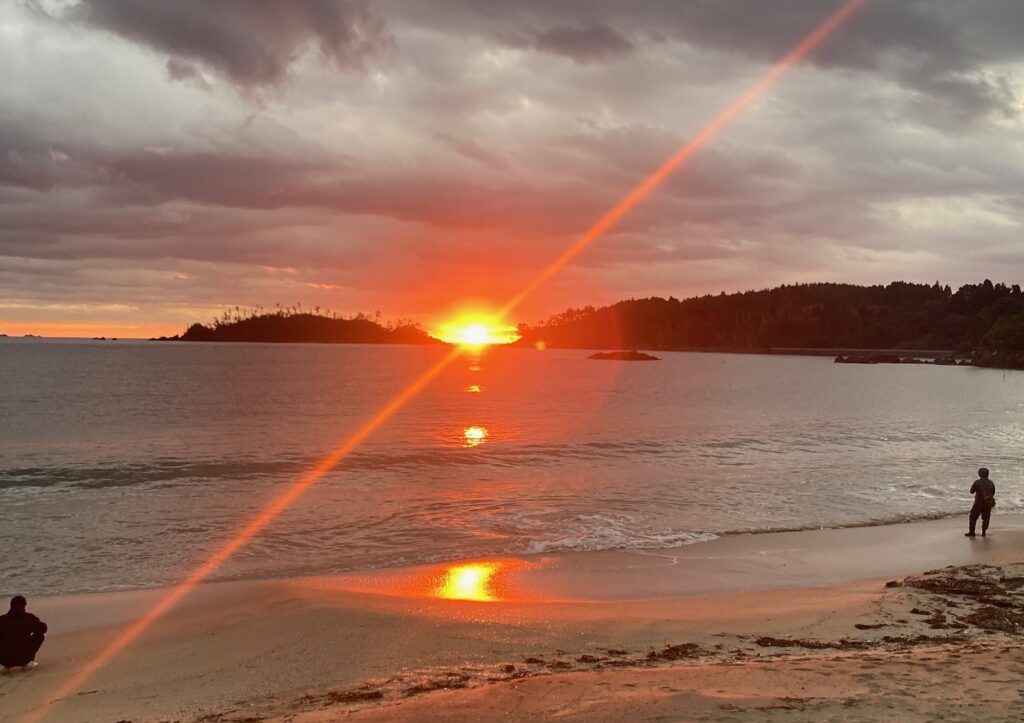 2日目は小田の浜の日の出と共にスタートし、その後、オガトレ朝のストレッチで身体のリフレッシュ!朝食時には明海荘女将さんに震災体験談をお話しいただきました。そして、前日にマッチングした各事業所の見学会へ。それぞれの事業所へ2~3名ずつ訪問していただきました。見学会では、前日の発表では伝えきれなかった詳細をお話しいいただいたり、昼食を一緒に食べ交流を深められていました。見学会終了後は、内湾にてKNEWSさんが企画する「夢叶エール出船体験」。みなさん、お互いのセカンドキャリアへの「出航」にエールをおくっているかのようでした。