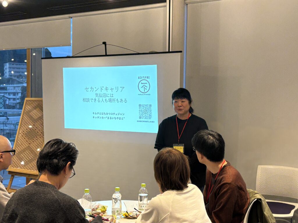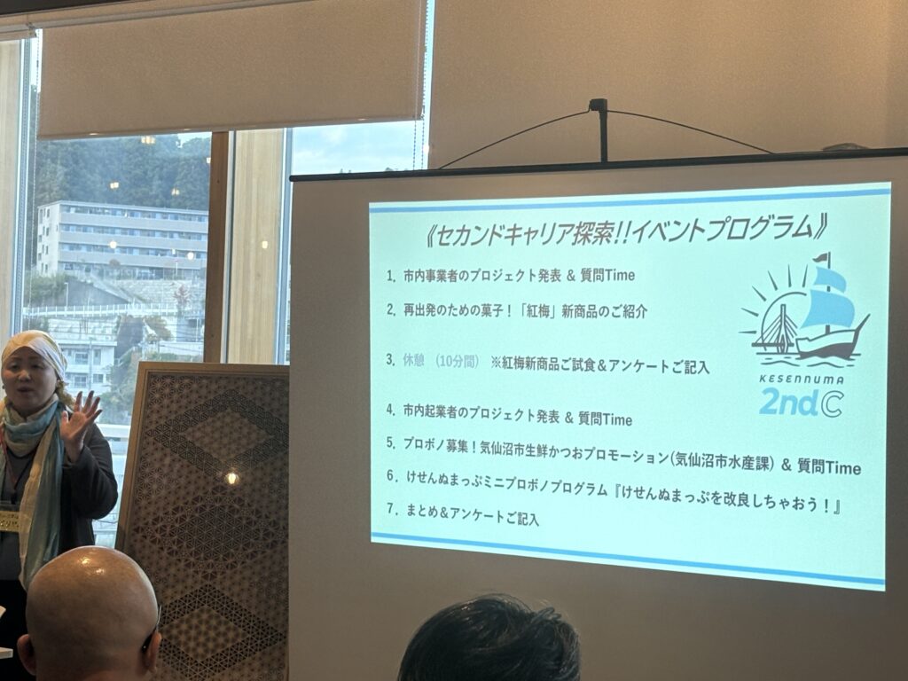 続いて、「セカンドキャリア探索イベント」。市内事業者・起業者のプロジェクト発表や「けせんぬまっぷ」のミニプロボノプログラムを実施しました。参加者のみなさんに各事業者の発表を聞いていただいた後、興味を持って更に話を詳しく聞きたいと思った事業所に翌日見学にいっていただくといった形式でした。市内事業者のみなさん、個性豊かでそれぞれの良さが伝わるような発表で、参加者のみなさんも真剣に聞き入りかつ楽しんでおり、イベント全体に一体感を感じさせる、そんなイベントとなりました。